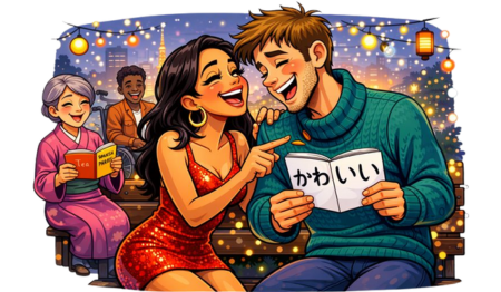 “Te quiero con todo mi corazón,” she murmurs, letting the words roll off her tongue like a secret spell. Mike chuckles softly, leaning just a touch closer. “Exactly like that,” he says, and for a moment, it feels as if Tokyo itself exists just for them.