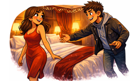 Gina’s eyes light up as she pulls Mike down a quiet side street. The neon signs here are subtler, yet each one carries a promise: privacy, passion, and a world just for the two of them.