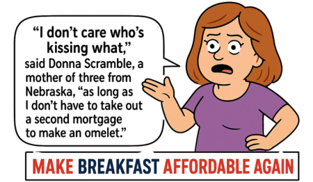 “I don’t care who’s kissing what,” said Donna Scramble, a mother of three from Nebraska, “as long as I don’t have to take out a second mortgage to make an omelet.”