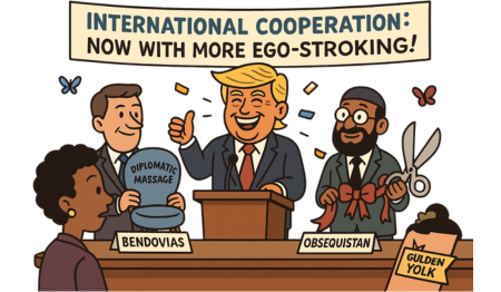 Unconfirmed reports suggest Obsequistan has renamed its capital to Trumpsgrad, while Bendovias is exploring trade incentives involving diplomatic massages and complimentary infrastructure photo-ops—no poto-ops.